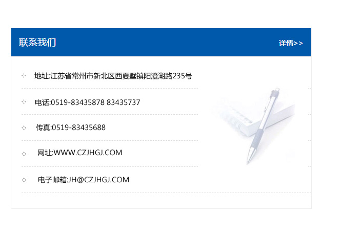 地址:常州市新北區(qū)友邦商務(wù)大廈1幢16、17層  電話:0519-85101652  傳真:0519-85112595  郵編:213022  網(wǎng)址:www.cz-jiayue_cn.dazuige.com  郵箱:xiajifengaa@163.com